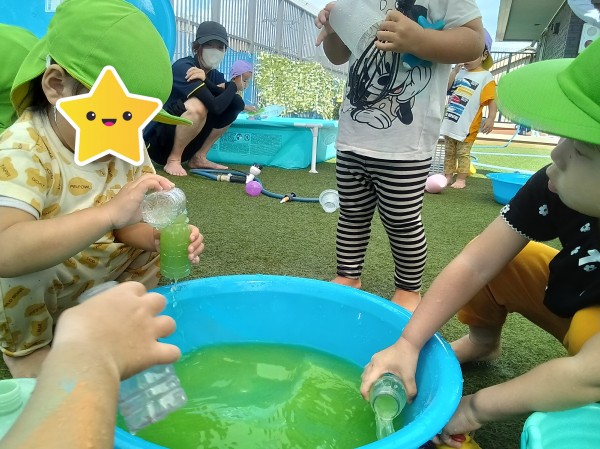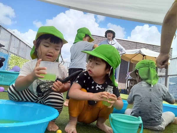 屋上園庭で、水遊び
