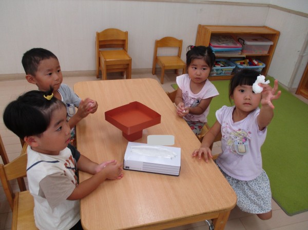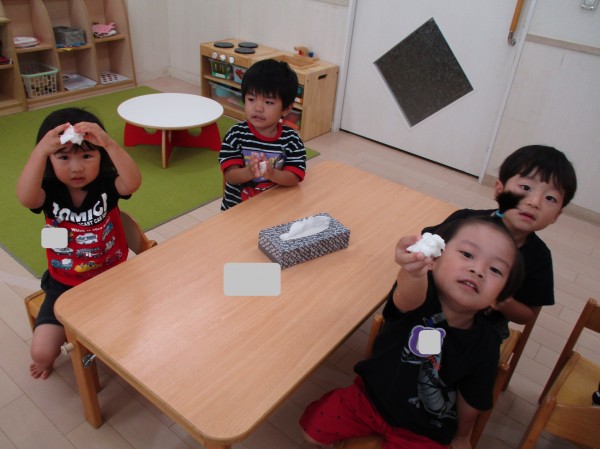 ティッシュをくるくる丸めてお団子を作りました。