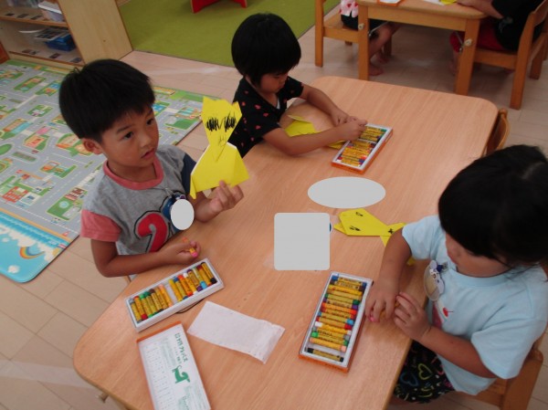 クレヨンできつねの目や口、おひげなど‥見本を見ながら上手に描いていました。