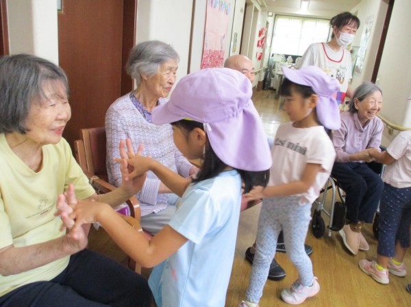 一緒に手遊び歌で遊ぼうと、くじら組さんはおじいちゃんおばあちゃんの元へ。