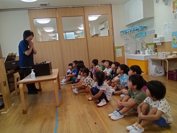 先日3歳児で実施した手洗いチェッカーを使用した手洗い指導を、本日は4・5歳児に行いました。