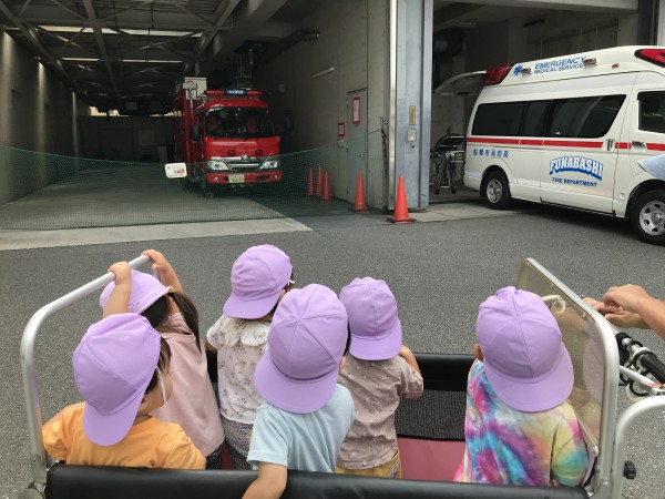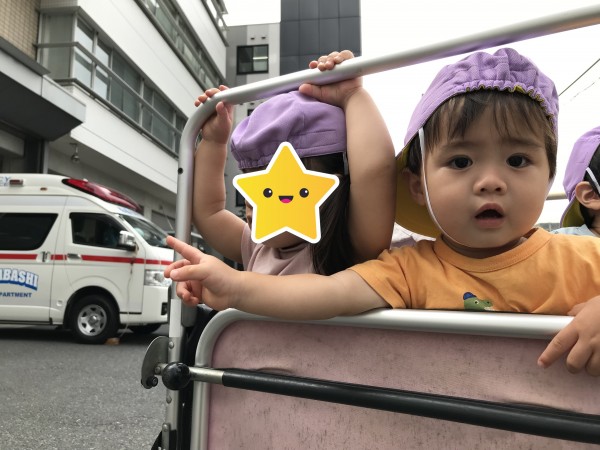 今日の散歩は、消防署に救急車と消防車を見に行きました。
