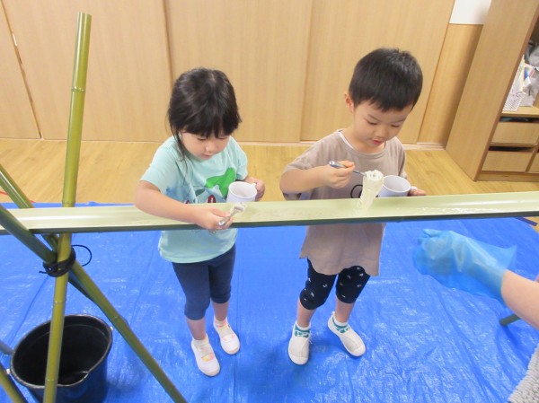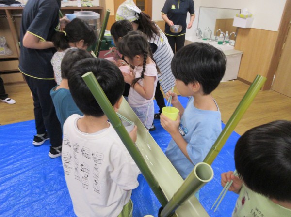 8月、昨年度の夏に絵本献立として行った『流しそうめん』が子ども達に好評で「つぎのなつもやりたい!」と、昨年度からリクエストされていたので、夏の恒例行事に出来たらと、今年度も取り入れました。