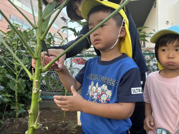 茹でたオクラを醤油とおかかで和えて食べました。美味しかったようで、おかわりを欲しがる子もいました‼