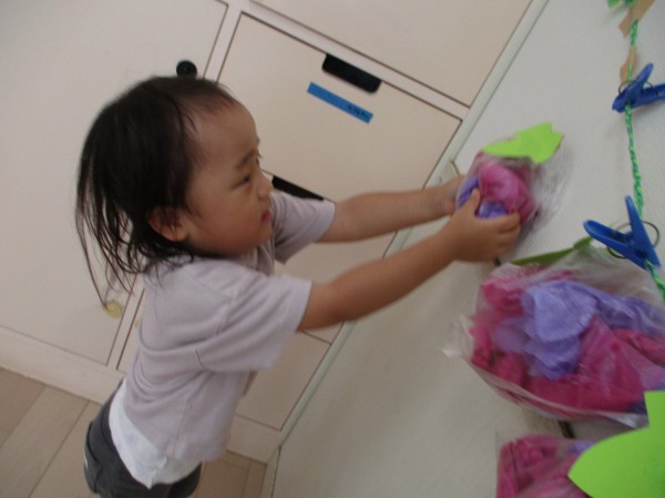 「むらさきがいい!」「くしゃくしゃ~」とお話をしながらお花紙を袋に入れていき、可愛いぶどうを作りました(*^-^*)