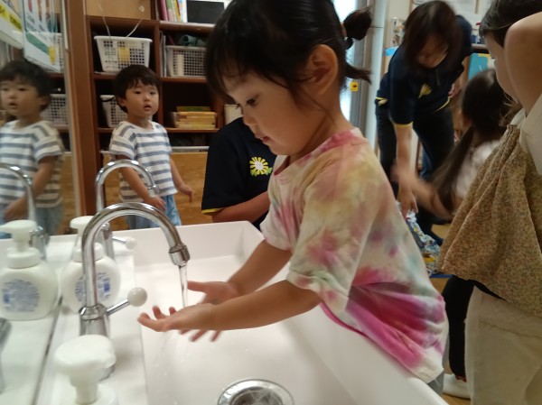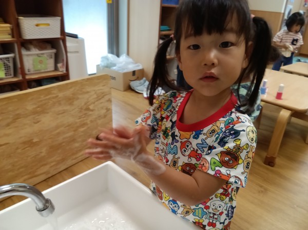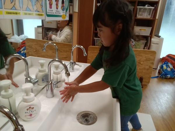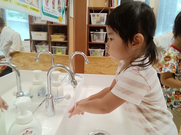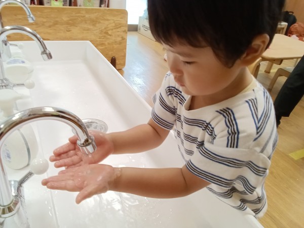 クラスでも、せっけんを手にとったら一度水を止めるよう保育士が声掛けをしています。大人も流しっぱなしのまま洗うことが多いので、まずは大人から、水を止めてしっかり泡で洗うようにしていくことが大切だと感じました。