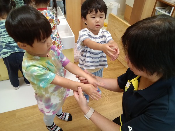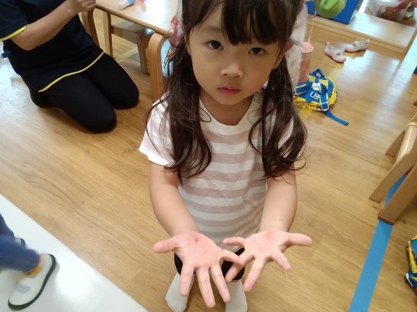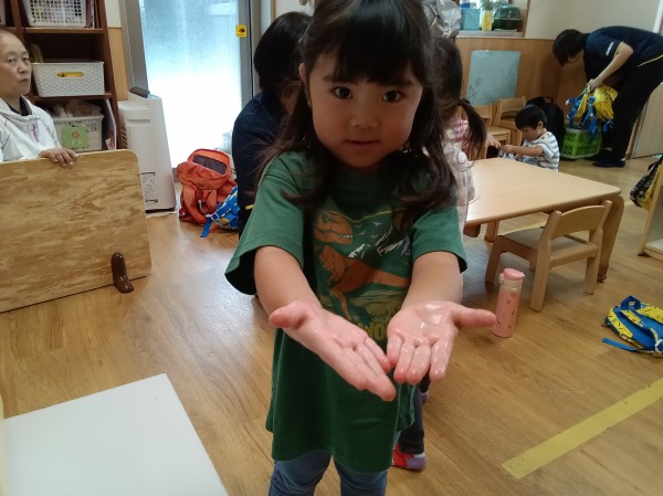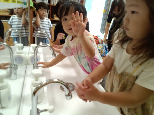 屋外活動から帰ってきた時の手洗いは習慣になっています。荷物を片づけるとすぐに洗面所に向かう子どもたちに、今日はスタンプで手洗いチェックを行いました。ほとんどの子が、せっけんをつけてからすぐに水で流してしまおうとします。すぐに水で流した子は、スタンプが落ちません。せっけんをつけてからしっかり泡で洗った後に水で流すように伝えました。