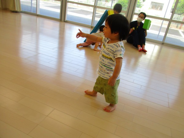この日はあひる組(1歳児クラス)のお友達と一緒にホールへ。先にあひる組さんがいるところへお邪魔したのですが…