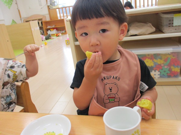 「お芋の味だね」「おいしいね」等と保育者やお友達と会話をしながら、秋の味覚を楽しんでいました(^o^)