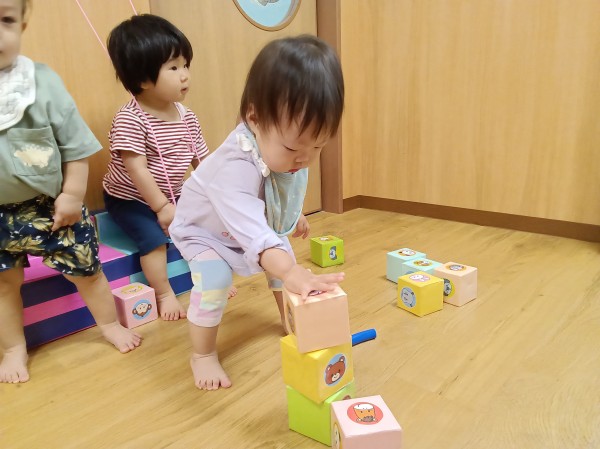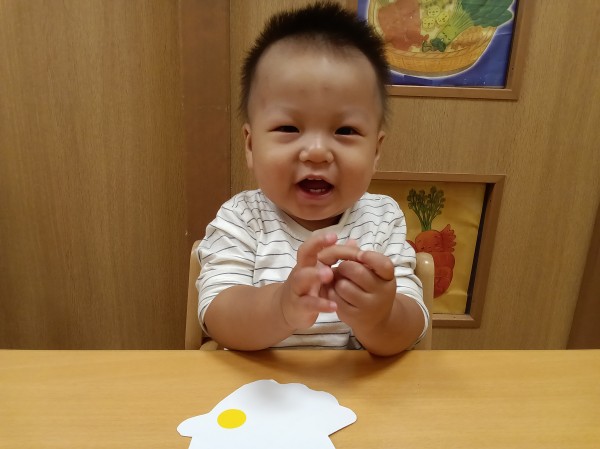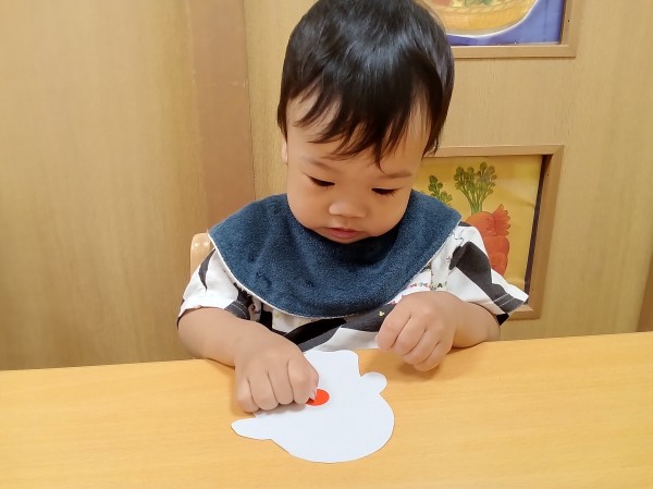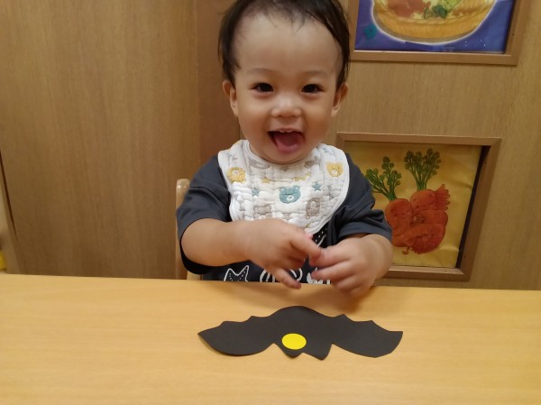 今日は、保育園で始めてシール遊びをしました。今月のハロウィンに向けての制作をした子どもたち。保育者にお手伝いしてもらいながら貼ったり、手にシールがくっつき両手で持ち替えたりしながら一生懸命取り組んでいました。集中しすぎて口からうっかりよだれが出してしまう場面は微笑ましかったです。その後は、マットのトンネルをしたり、絵本を見たり好きなおもちゃで遊びました。また、うさぎ組さんのお部屋に行ってお姉さんたちと一緒に遊んだり、保育園内の探検を楽しみました。