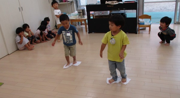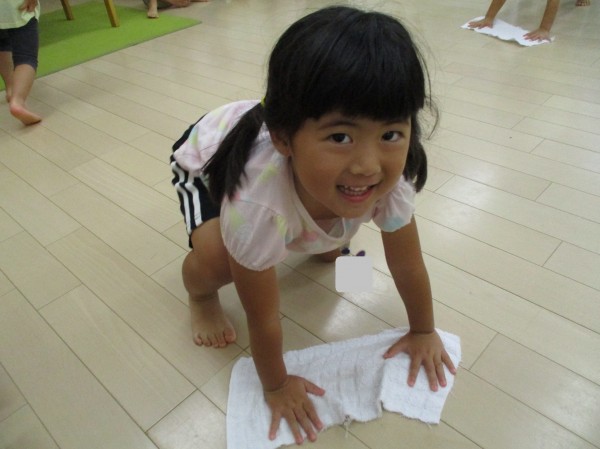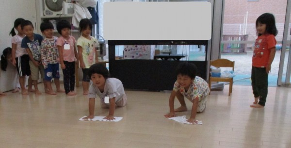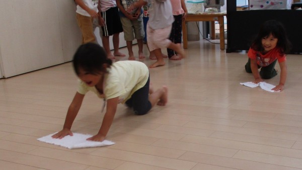 2回目は雑巾かけのように行いました。保育者は出来るかな?と思いましたが、思いのほか早くレースが進み、勝ったチームの子はとても嬉しそうに喜んでいました。