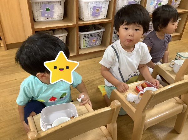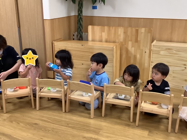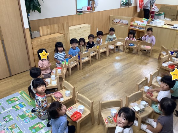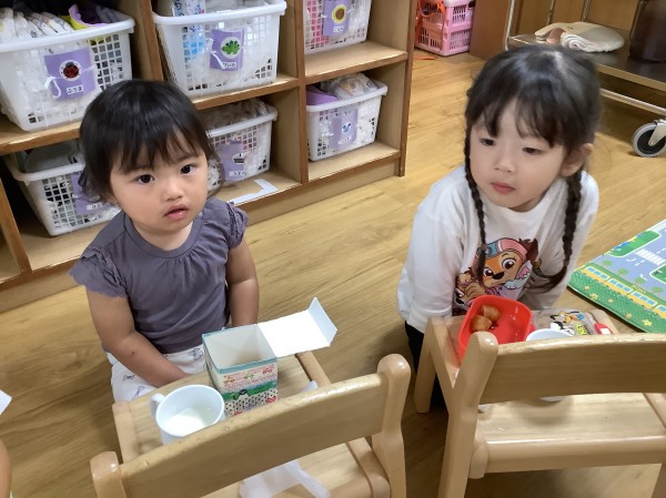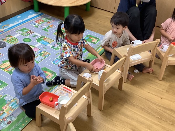 今日はうさぎ組がりす組のお部屋に行きみんなで一緒におやつを食べました。
