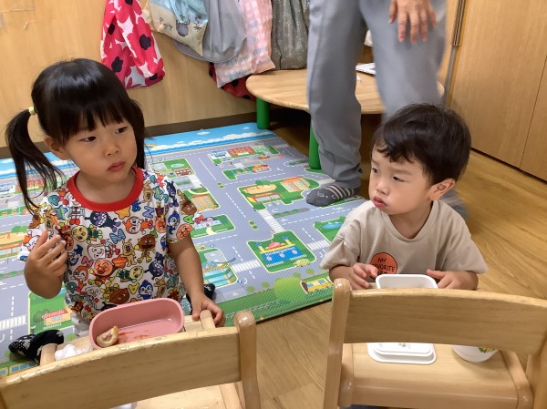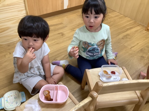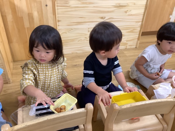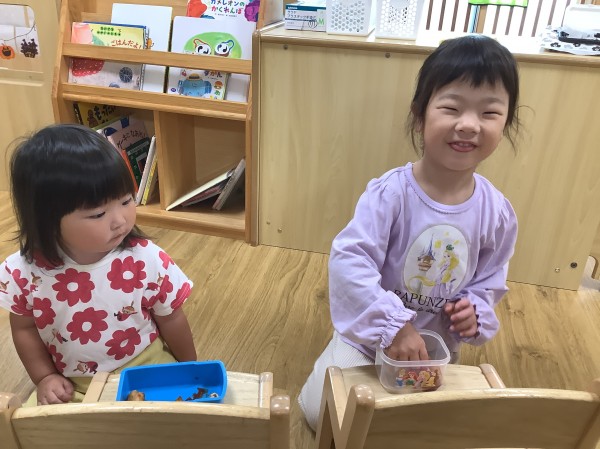今日はお弁当箱の日。お家から空のお弁当箱を持って来ておやつを入れてもらいます。