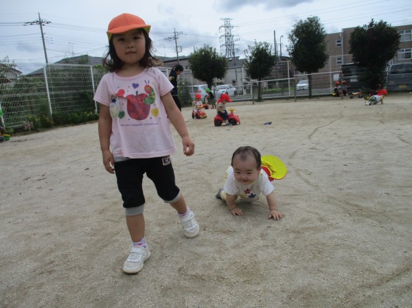 こどもの家・志木中宗岡 たまご組(0歳児クラス)園庭で遊ぼ♪\(^o^)/