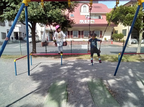 秋晴れの中ぱんだ・きりん・ぞう組の3クラスで、公園に遊びに行きました。公園へ到着すると、「やった!遊ぼう!!」と嬉しそうに方々に走って行った子どもたち。「鬼ごっこする人~?」と言うと「やるやる~!」と言いながら数人が集まってきて“鬼決め”が始まったり、ブランコへ走って行き「せんせ~い、大きくこいで!」と言ったり、鉄棒へ行き、ブタの丸焼きや、コウモリなどの練習をしたり、みんながそれぞれ好きな遊びを楽しみました。