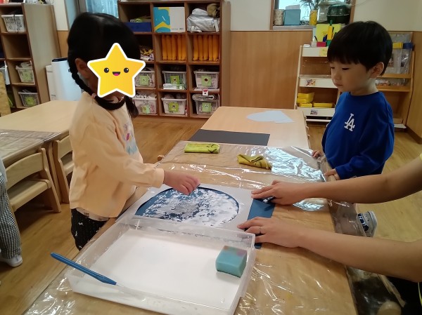 スポンジに絵具をつけて、おはけの型抜きをしました。