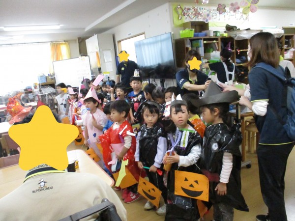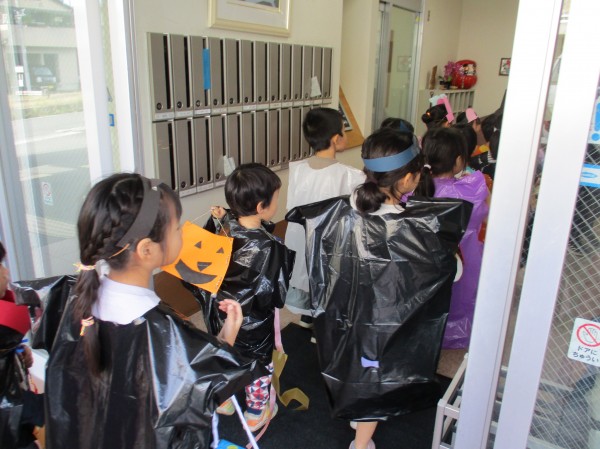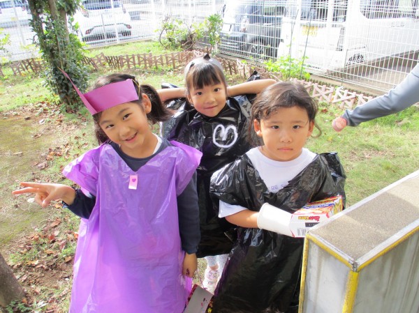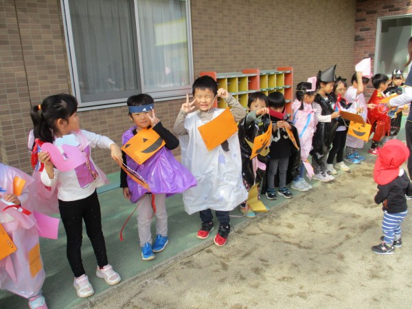 4.5歳の子ども達は、自分達で作った衣装を身にまといお菓子を入れるバックを持って、朝からとっても嬉しそうな様子(*‘∀‘)