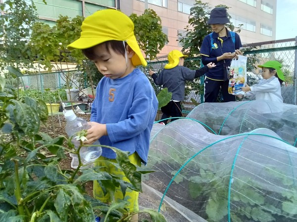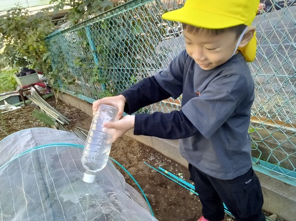 畑ではブロッコリーや大根、白菜が大きくなっていて、「もっと大きくなあれ!」とお願いしながらみんなで水やりをしました。