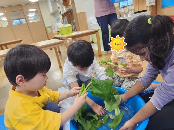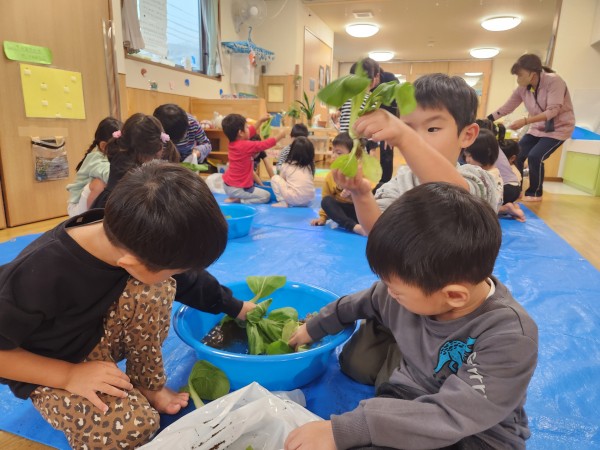 ぱんだ組が屋上で育てた小松菜とチンゲン菜が大きく立派に生長したので収穫をしました。太陽の光を存分に浴びた小松菜は大きく青々となりました。そして次の日、収穫した小松菜を水を張ったタライの中でざぶざぶときれいに洗いました。夢中に洗う子どもたち、きれいになった小松菜に大喜びです。そして、遊びは発展していき…どうぞ様子をご覧ください。