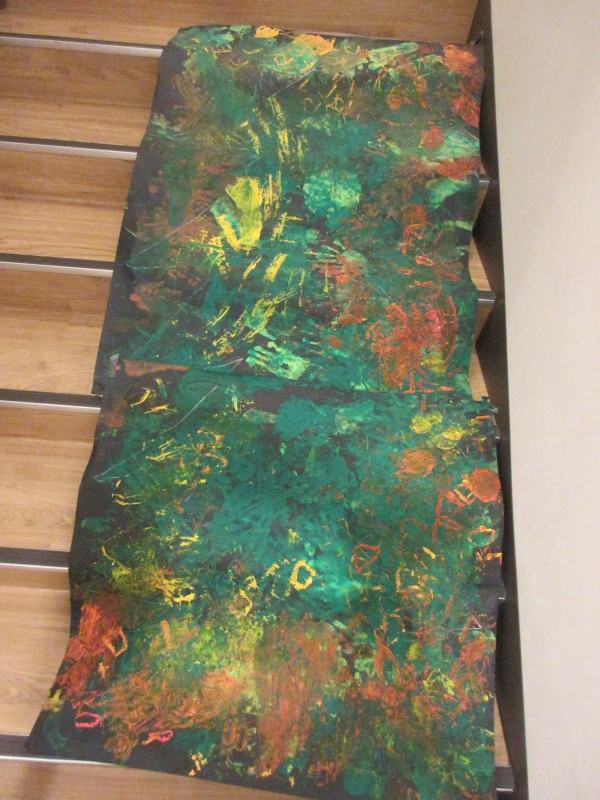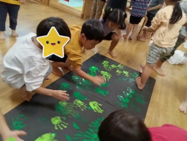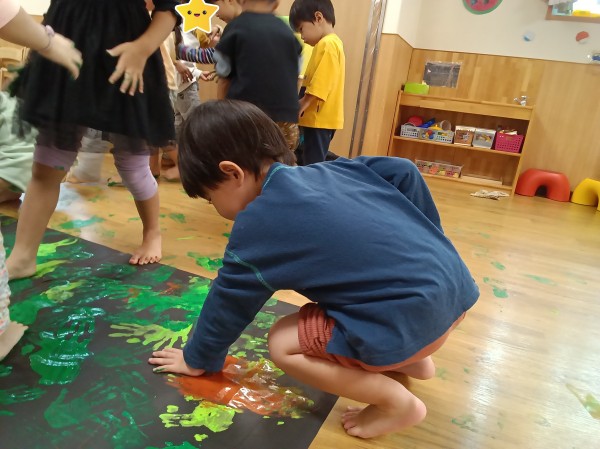 裸足になった子どもたち。そのまま遊びは発展し…模造紙に緑、黄緑、茶色の絵具で色をつけることにしました。初めは手でぺたぺた色付けしていましたが、夢中になるうちに足を使う子も出てきて、模造紙から絵具がはみ出るほどダイナミックな絵具遊びになりました。