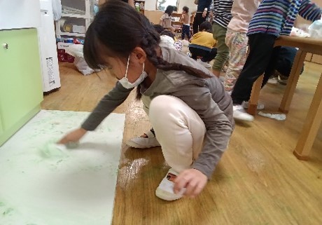 ただ、床を見るとそこには緑や茶色の絵具が…『みんなで綺麗にしよう‼』