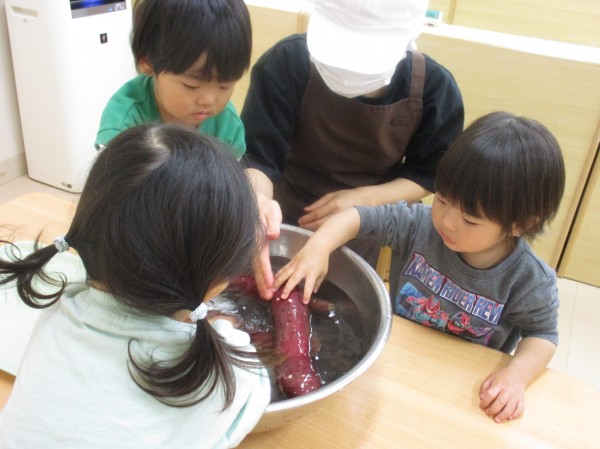 あひる組になって初めての食育で『さつまいも洗い』を行いました(*^▽^*)