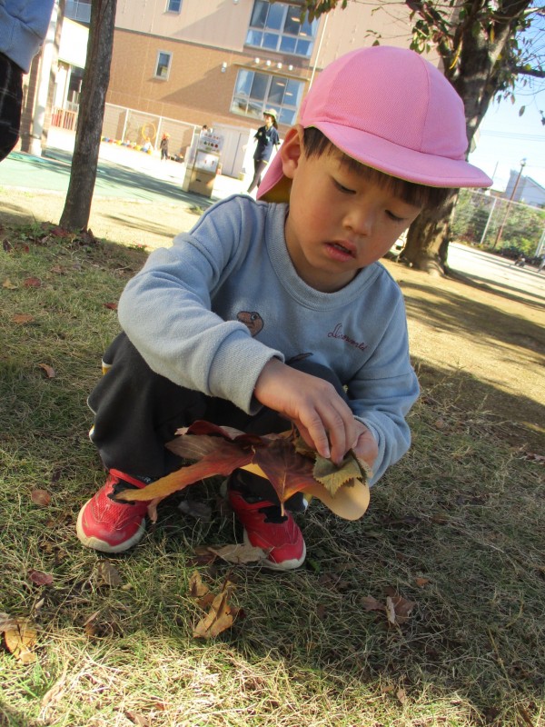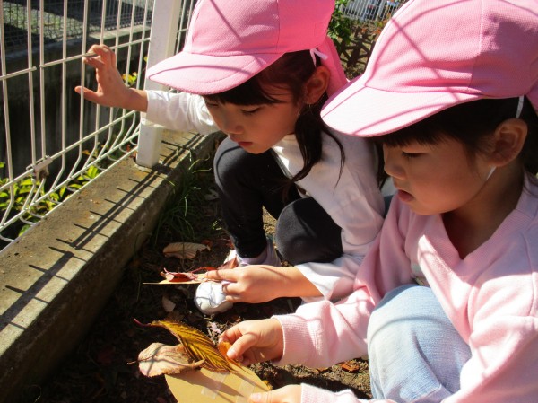 「どの落ち葉にしようかな~」と、園庭にある落ち葉をじっくり見て探す子どもたち。