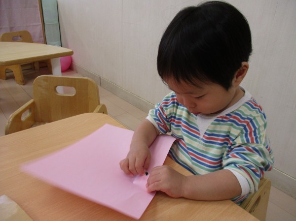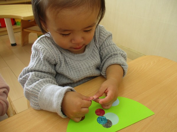 保育者が紙にシールを貼って見せると「!(*'▽')」と目を輝かせて興味を持ってくれました。