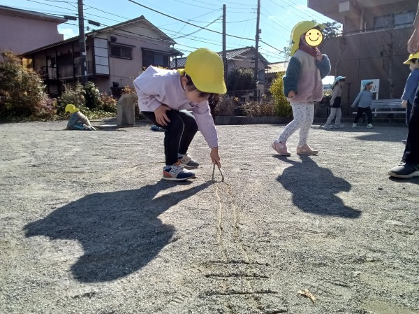 氷鬼をしてたくさん体を動かしたり2本に割れている木の棒で地面に線を書いてお絵描きをしたりして楽しんでいました。走っていると暑くなるほどいいお天気で、何度も水分補給をしながら外遊びを楽しんでいた子どもたちです。