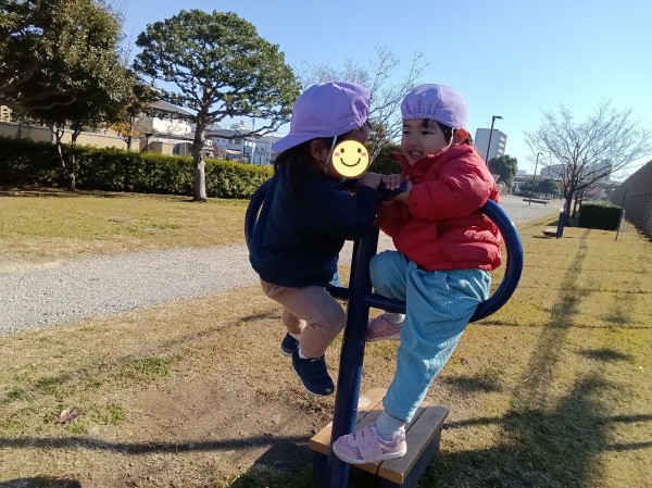 ぽかぽか陽気の中、みんなで手をつないで公園に散歩に行きました。