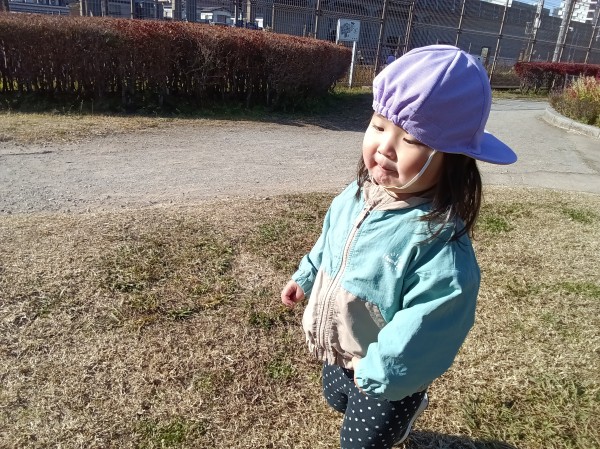 道中、保育者の真似をして「おはようございます!」とすれ違う人にあいさつをする姿は、今までも多く見られていましたが、今日は公園に遊びに来た人にいつもよりも元気よく挨拶することができて、感心するほどでした。一人が挨拶すると、他のお友だちにも伝染していき、みんな「こんにちは!」とあいさつすることができました。