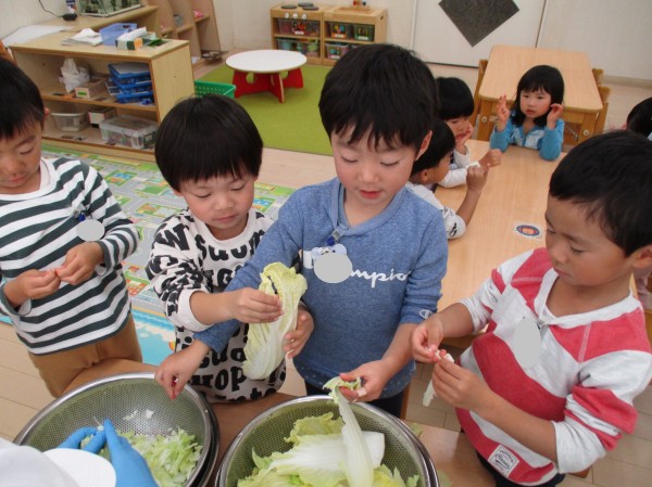 こどもの家・志木中宗岡保育園 食育、白菜をちぎったよ!!3歳児(ぺんぎん組)