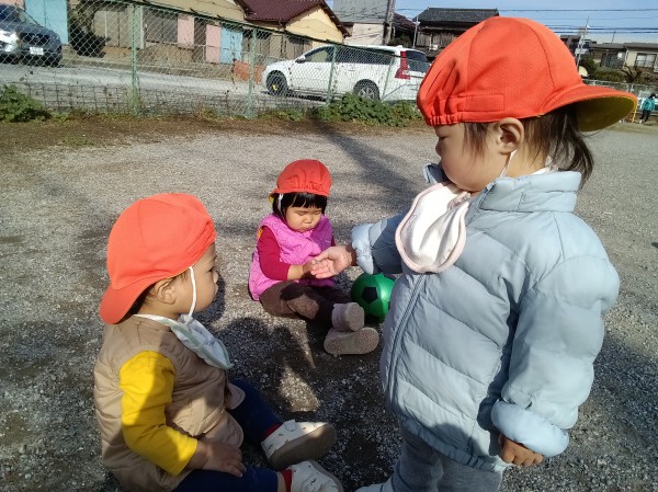 最近は同じクラスのお友だちの顔を覚え、『○○ちゃんはどこ?』と聞くと本人を探して指差しする姿がみられるようになりました。また、お友だちの顔をのぞきこみ何やら話かけるような仕草をしたり、おもちゃを手渡す姿がみられるようになりました。一人ひとりの気持ちを受け止めつつも、お友だちとの関わりの場面も見守っていきたいと思っています。