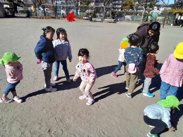 今日は異年齢で過ごしました。ぞう組の子どもたちがうさぎ組さんの手をとり、一緒に歩いて公園に向かいました。公園には他園のお友だちも遊んでいましたが、そのお友だちとも一緒に鬼ごっこを楽しみました。