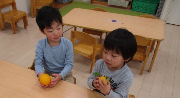 「(表面が)でこぼこしてるね」「いい匂いがする!」と言って、柚子の触り心地や香りを堪能していました。