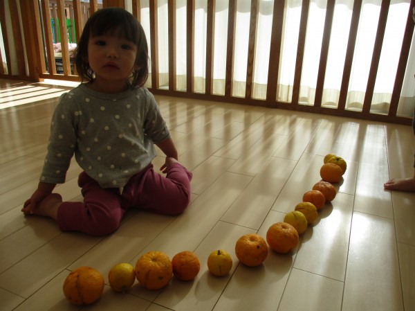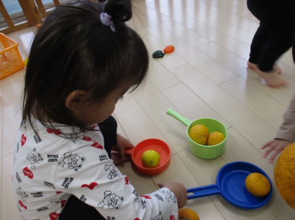 柚子が気に入ったようで、後日また柚子を出して遊びました。フライパンやコップを使っておままごとをしてみたり、沢山並べて「おおきい」「ちいさい」「葉っぱ付いてる」等と発見したことを嬉しそうにお話ししてくれたりと、色々な楽しみ方をしていました。