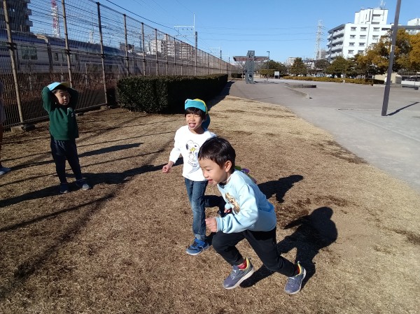 保育者やお友だちと手を繋いで、公園に行きました。