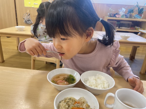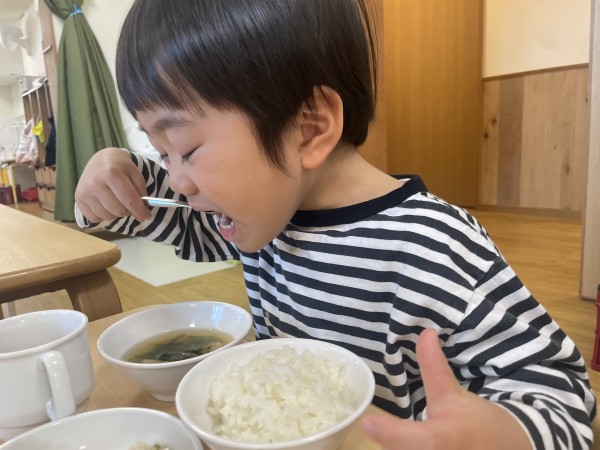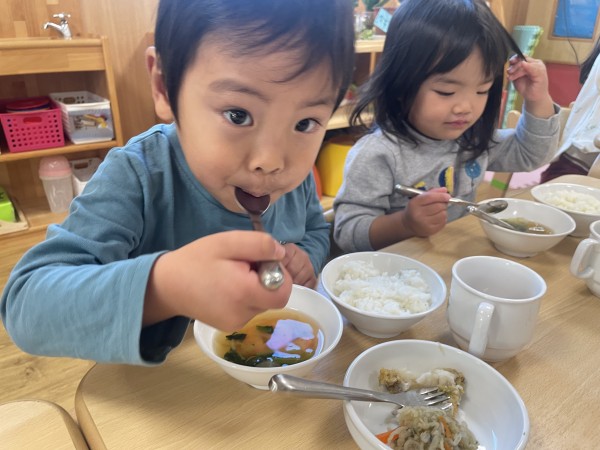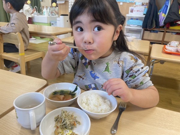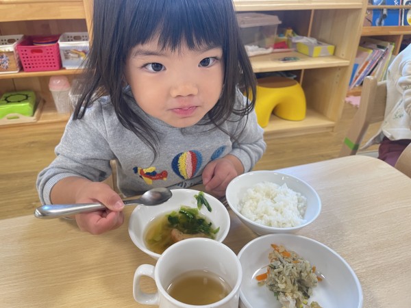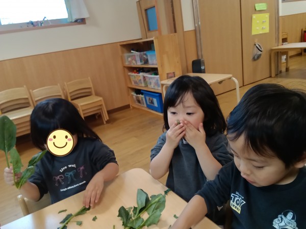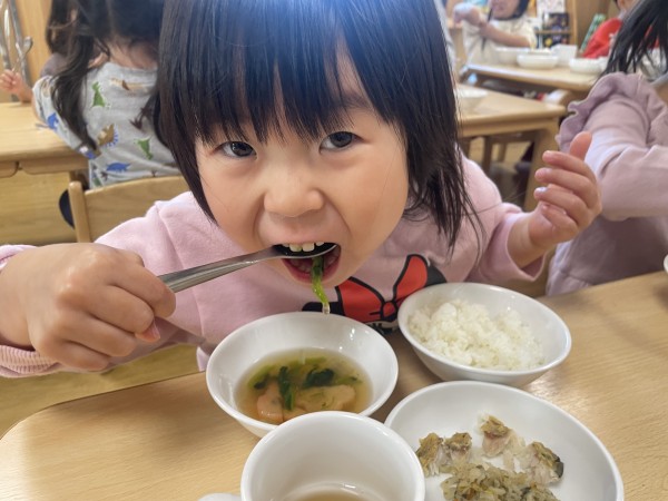 今日の給食のお汁ものは、みんなでちぎったほうれん草。おいしくいただきました!