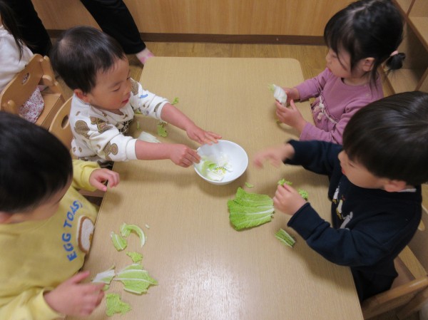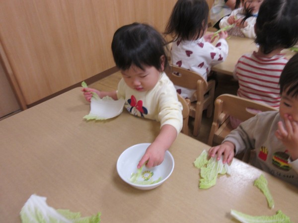 無理せず遠くから観察していた子も、最後は楽しんで白菜ちぎりに参加していました(^^♪