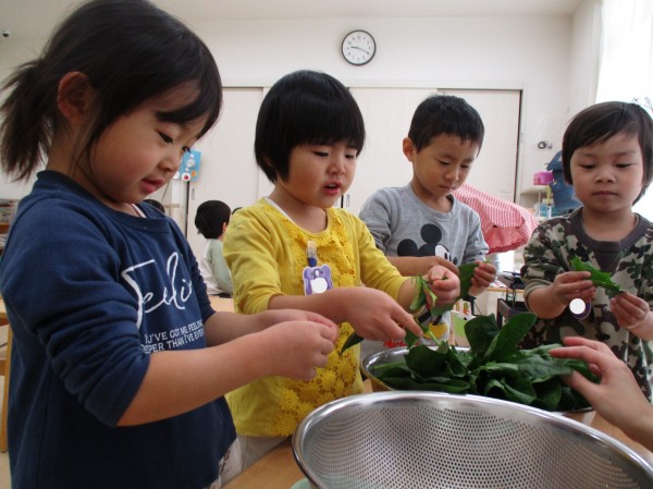 先日、おすましにはいるほうれん草を小さくちぎる食育をしました。