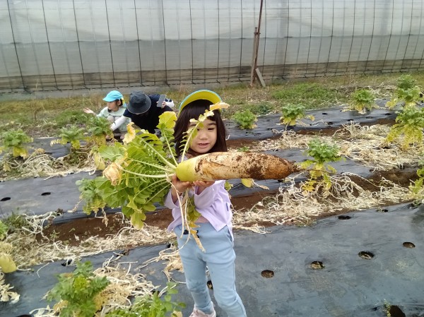 大根の収穫では、以前よりも土が固くなっているので、踏ん張らないと抜けませんでした。