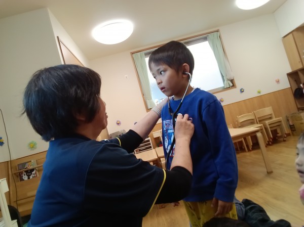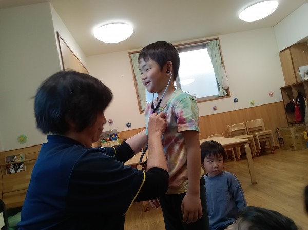 体長数センチの頃に心臓が動き始めてから今まで、みんなの心臓はずっと動いていることを伝え、自分の心臓の位置を確認しました。位置と大きさを確認した後、心臓の音を聴診器で聞いてみることにしました。