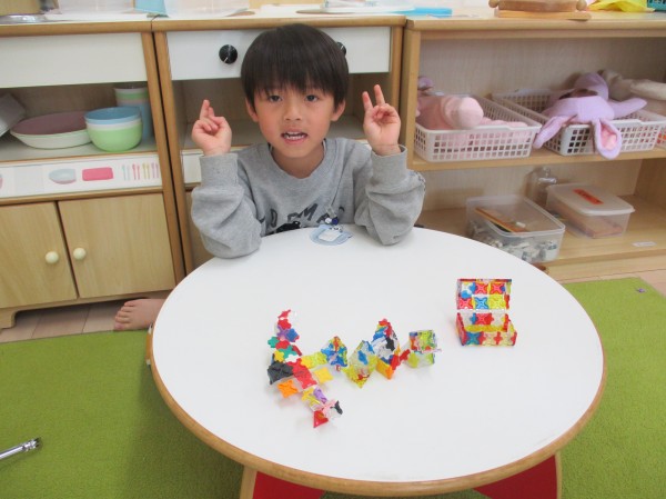 室内遊びで遊んでいるとラキューやブロックなどで素敵な作品を作り上げていた子ども達。カメラを向けるとポーズをしてくれました。(*^^*)