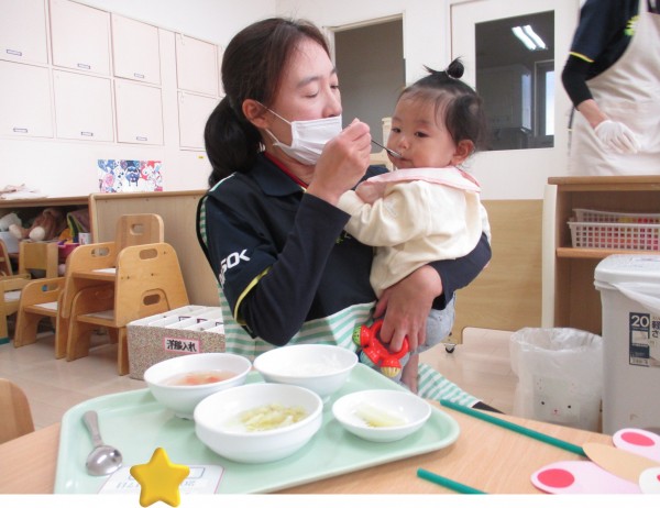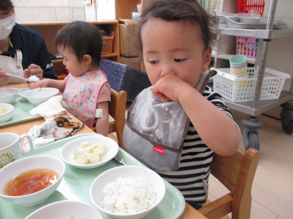 まずは、1歳児クラスの子ども達。大きなお口でパクパク食べていますね( *´艸`)