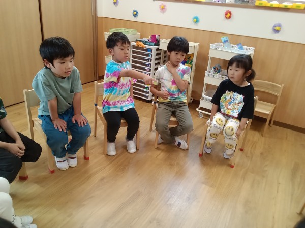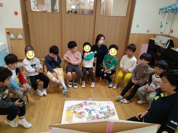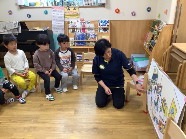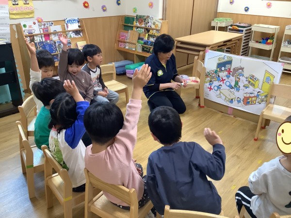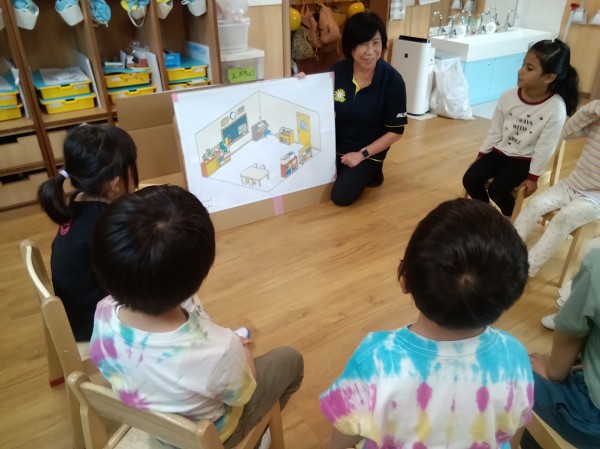 4月は、全職員に「船橋市で起こりうる災害とその備え」の研修を実施いたしました。近年発生が予測されている地震や、温暖化の影響での集中豪雨などの災害の危険性と、どのように備えるべきかを周知しました。今回、こどもたちについても、「自分の命は、自分で守る」ために、防災教育を行いました。日本赤十字社の防災教材「ぼうさいまちがいさがし」を使って、室内の危険な場所や、地震から身を守る行動についてお話をしました。