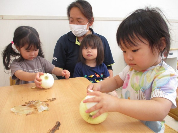 こどもの家・志木中宗岡 食育 新玉ねぎの皮むき(らっこ組)