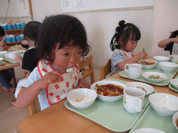 今日の給食のメニューはハヤシライス☆皮むきした玉ねぎもたくさん入っています。