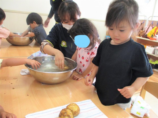 さっそくボウルに入れて水洗い☆「じゃがいもさんのお風呂だね、ゴシゴシしてね」とお話しするとみんな熱心にゴシゴシ・・・