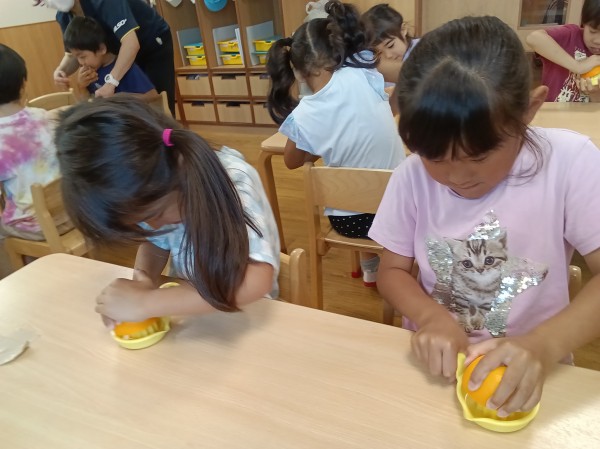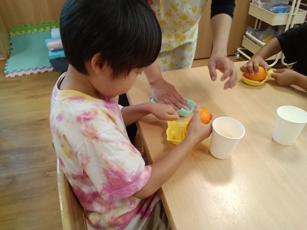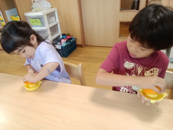 食育「オレンジ絞り、ジュース飲み比べ」