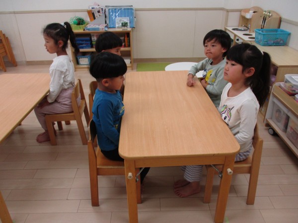 足裏をしっかり床に付けて姿勢を正すことや机と体はグー1個分空けることを教わったり、お椀の正しい持ち方を教わったり。